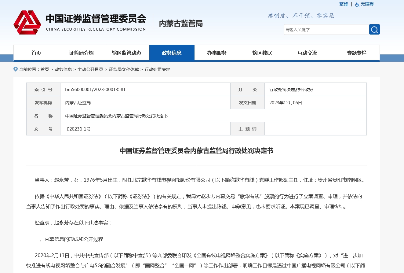 据内蒙古证监局网站6日披露的行政处罚信息,北京歌华有线电视网络股份有限公司(以下简称歌华有线)时任党群工作部副主任赵永芳被罚没逾80万元。