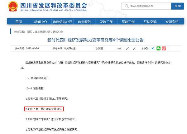 昨日下午巨丰情报从四川省发改委网站获悉,该委公开了“新时代四川经济发展动力变革研究等4个课题比选公告”,公告称,四川省发展和改革委员会对“新时代四川经济发展动力变革研究”等4个课题承担单位进行比选,兹邀请符合条件的研究单位参加。共涉及到四个项目分别为: