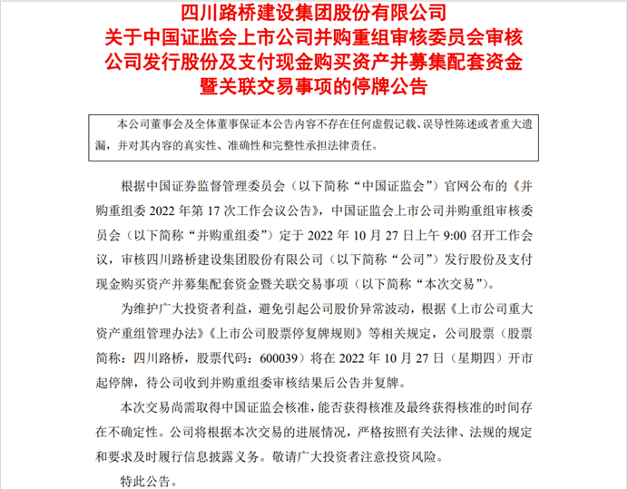 为维护广大投资者利益,避免引起公司股价异常波动,根据《上市公司重大资产重组管理办法》《上市公司股票停复牌规则》等相关规定,四川路桥公司股票将在2022年10月27日(星期四)开市起停牌,待公司收到并购重组委审核结果后公告并复牌。