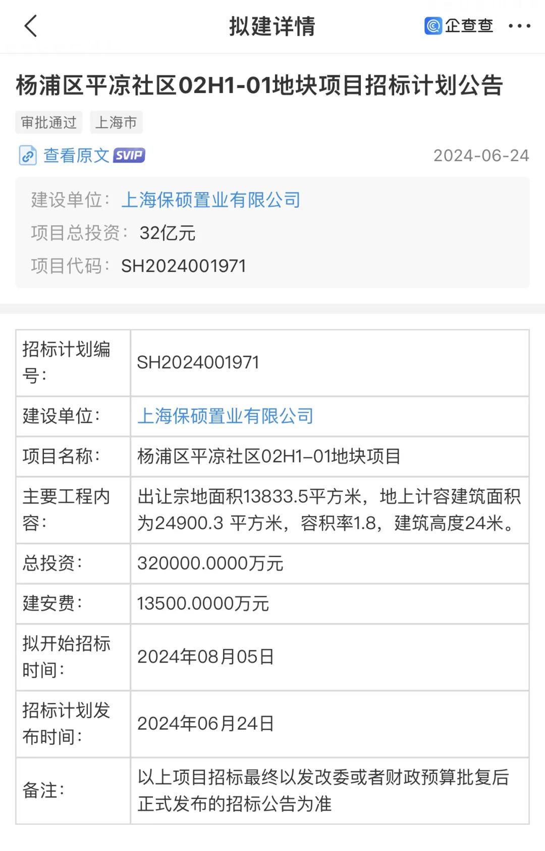 上海市建设工程交易服务中心网站显示,早在6月24日,保利发展就以上海保硕置业有限公司的名义发布了该地块的项目招标计划公告,公告称该项目总投资为32亿元。