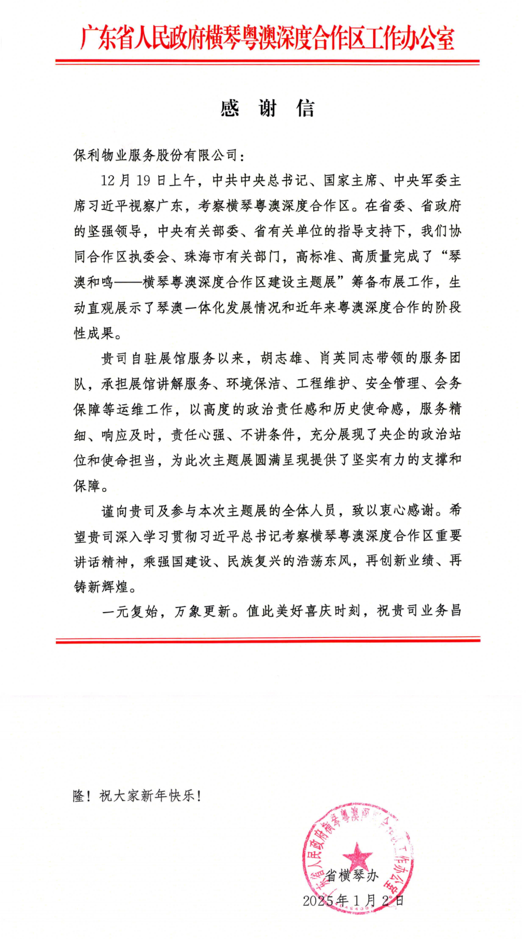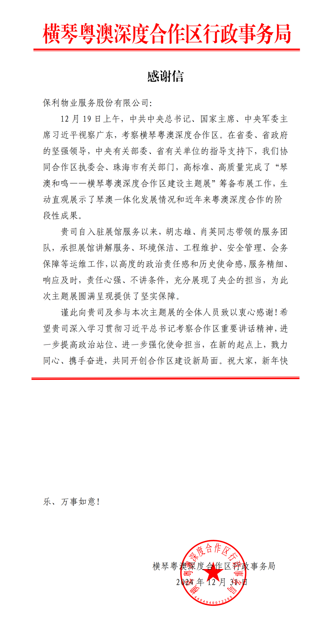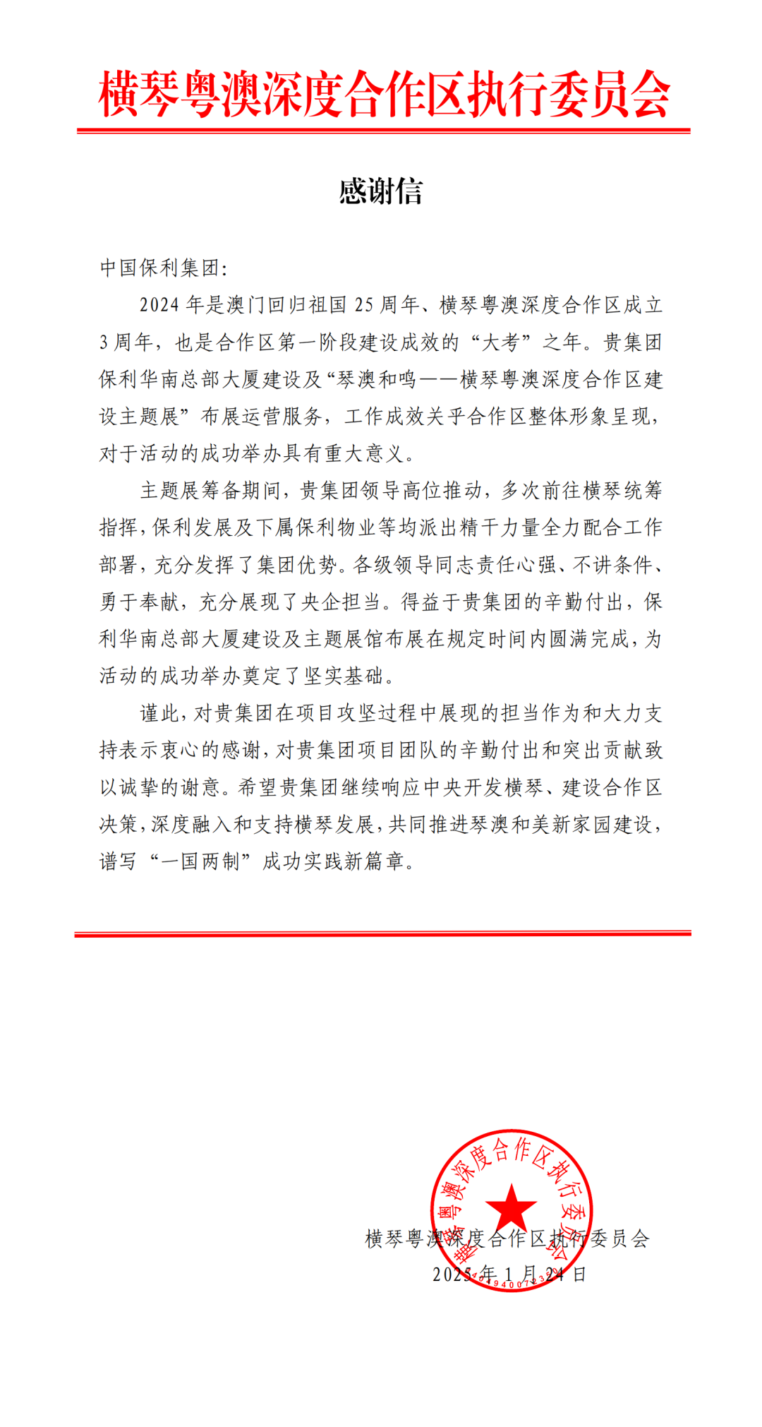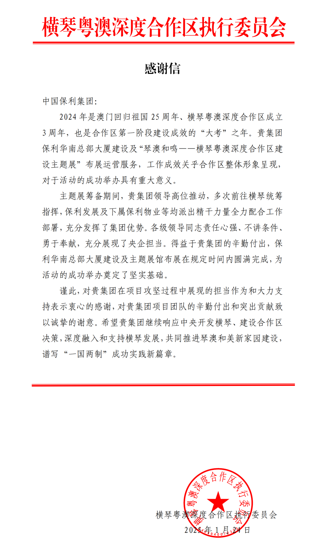 1月24日,中国保利集团收到了一封来自横琴粤澳深度合作区执行委员会的感谢信。信中,执行委员会高度赞扬了保利集团在澳门回归祖国25周年、横琴粤澳深度合作区成立3周年之际,所展现出的卓越担当与无私奉献。特别提及了保利发展华南公司大厦建设及“琴澳和鸣——横琴粤澳深度合作区建设主题展”布展运营服务的圆满成功,这不仅为合作区整体形象的呈现增色添彩,更为活动的成功举办注入了强大的动力。