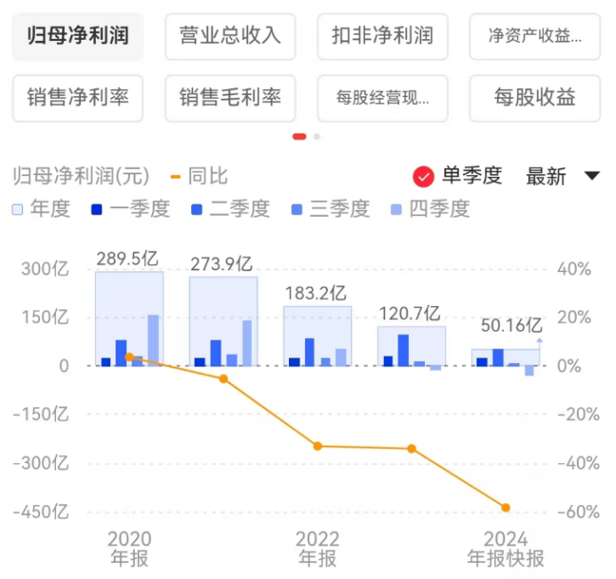 2020年至2023年的归母净利润是逐年下滑态势,分别为289.5亿、273.9亿、183.2亿、120.7亿,已经连续下滑了3年,同期的销售毛利率、销售净利率同样是逐步走低,到2023年底销售净利率只有5.16%了。