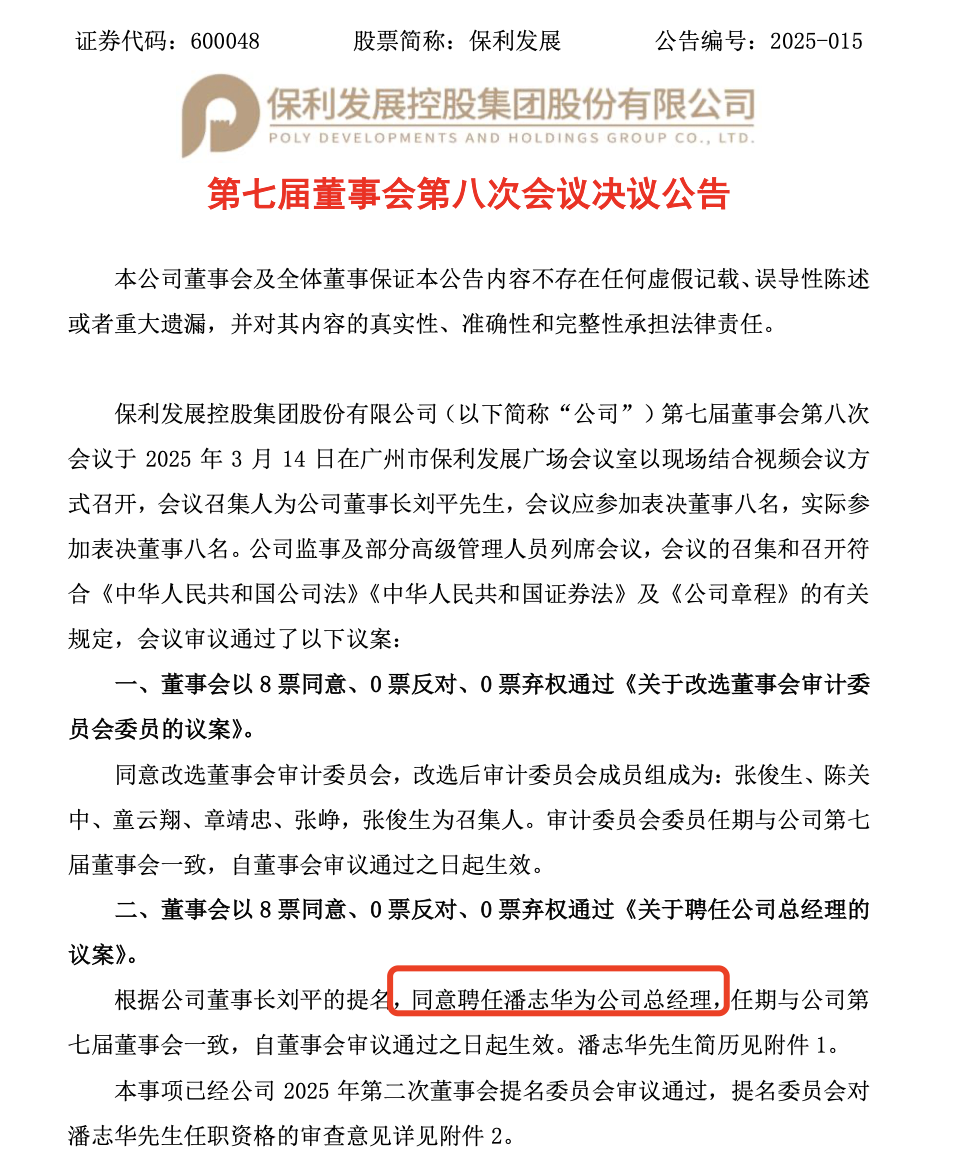 公告提到,公司正式聘任潘志华为公司总经理,任期与公司第七届董事会一致,自董事会审议通过之日起生效。在经历数月空缺后,保利发展总经理职位终于敲定了人选。