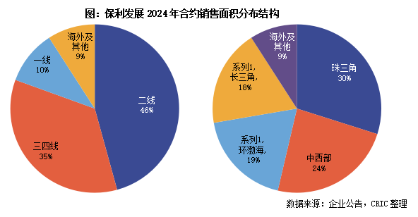 从城市能级来看,二线城市的销售面积占比为46%,同比降低5个百分点;三四线城市销售面积占比也同比降低了4个百分点至35%。整体看来,由于海外项目的销售增多,2024年保利的销售区域和能级的分布同比出现了较大的变化。