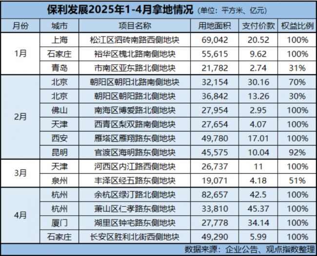 据观点新媒体统计,2024年1-4月保利发展共投拓拿地6宗,总权益价款约58.75亿元。2025年前四月,总拿地数量为15宗,总权益价款约253.55亿元。