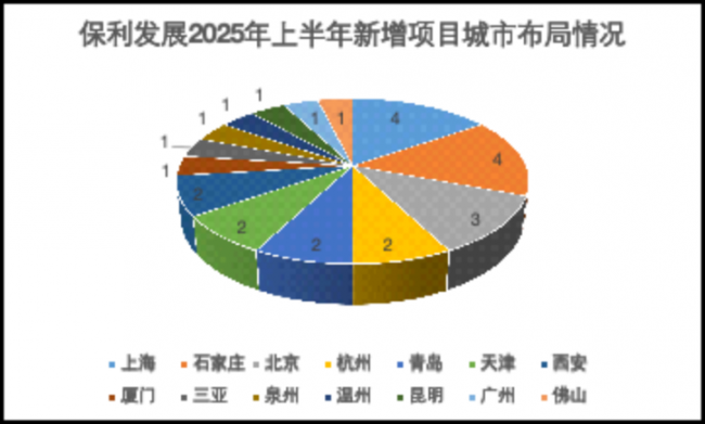 据观点新媒体统计,2025年1-6月,保利发展共拓展新项目26个,权益地价109亿元,涉及14座城市,主要以北京、上海、石家庄为主。而去年上半年,保利发展在拿地方面相对保守,仅拓展了12个新项目,权益地价109亿元。