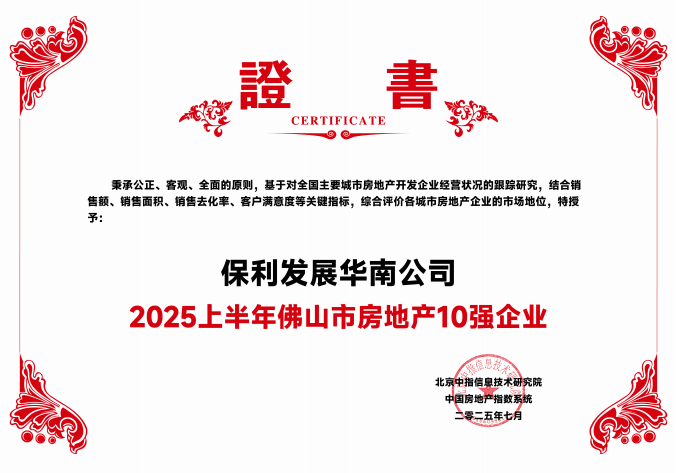 会上,经综合评定,保利发展华南公司基于优异的销售额、销售面积、客户满意度等关键指标表现,以强大的综合实力荣膺“2025上半年佛山市房地产10强企业”,在佛山市场持续保持领先地位。
