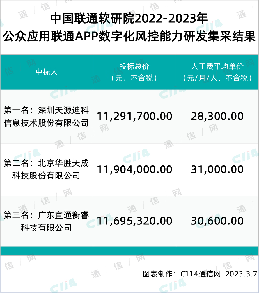 C114讯 3月7日消息(焦焦)从中国联通官网获悉,中国联通软研院日前公示了2022-2023年中国联通软研院公众应用联通APP数字化风控能力研发项目的中标结果,天源迪科、华胜天成、宜通衡睿三家中标。