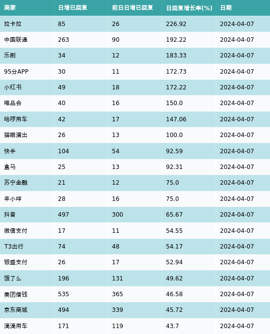 根据黑猫投诉网站数据显示:拉卡拉、中国联通和乐刷排在4月7日投诉回复增长率前三名,分别增长226.92%、192.22%和183.33%。其中拉卡拉新增85起,中国联通新增263起,乐刷新增34起。4月7日投诉回复增长率前20详情见下表: