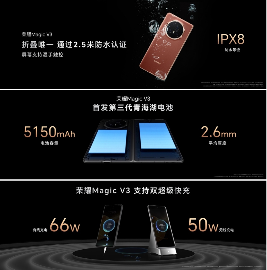 荣耀Magic V3支持IPX8级防水,是行业唯一通过2. 5米防水认证的折叠屏产品;荣耀Magic V3支持66W有线充电和50W无线充电,是轻薄折叠屏中首款支持无线充电的产品。与此同时第三代青海湖电池硅含量行业首次达到10%,荣耀Magic V3通过中国质量认证中心全天续航认证,带来更轻薄、续航更长久的折叠体验;影像方面也带来大幅升级,毫米级机身支持潜望长焦,强大的全焦段影像能力让折叠屏拍照体验跨越式升级。