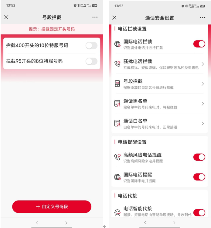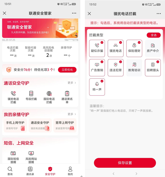 联通安全管家通过AI和大数据,可以对疑似诈骗、骚扰电话、保险理财等9种类型的电话提供提醒及拦截服务,支持号段拦截、国际电话拦截、通话黑名单拦截和通话白名单管理。被拦截的电话将转入智能代接,如此一来机主不会接到诈骗和骚扰电话,万一有误拦截的来电,也可以收到对方的留言提醒。这些功能在页面上都可以轻松设置。