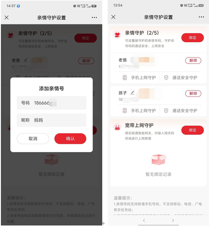 除了咱们自己的手机、短信、上网进行了安全防护,还可以为家里的老人、孩子的手机加上同样的防护功能。只需要在功能页面上添加家人的手机号,经过对方手机确认后,即可由联通安全管家进行全程监护,阻断诈骗和骚扰电话对家人的侵袭,亲情号最多可以添加五个人。