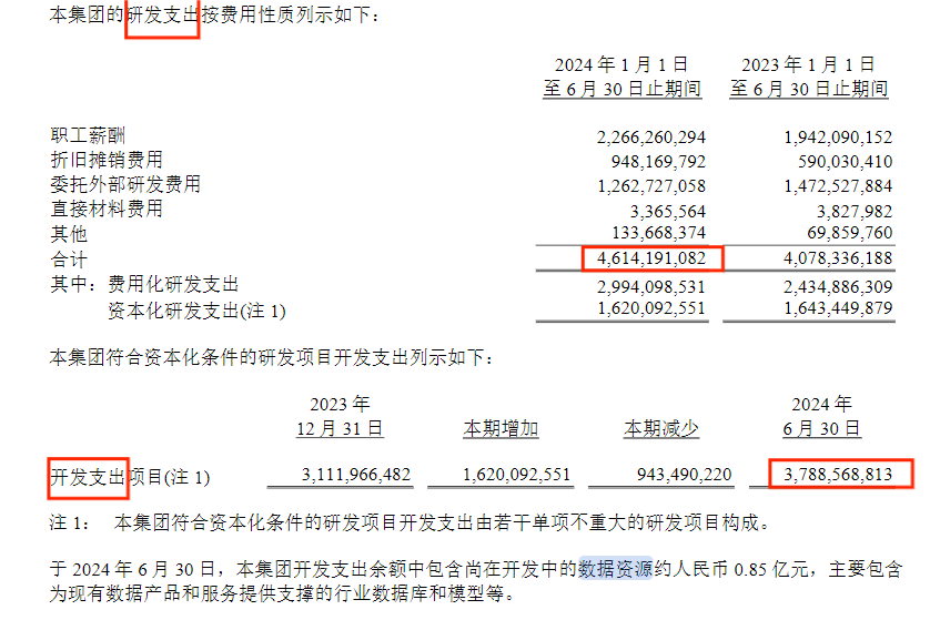 中国联通此次披露数据资源共8476.39万元,在2024年一季报中并未披露数据资源金额。半年报显示,中国联通上半年研发支出总计46.14亿元,同比增加13.14%,符合资本化条件的研发项目开发支出为37.89亿元,其中数据资源占比约2%。半年报指出:“2024年6月30日,本集团开发支出余额中包含尚在开发中的数据资源约人民币0.85亿元,主要包含为现有数据产品和服务提供支撑的行业数据库和模型等。”