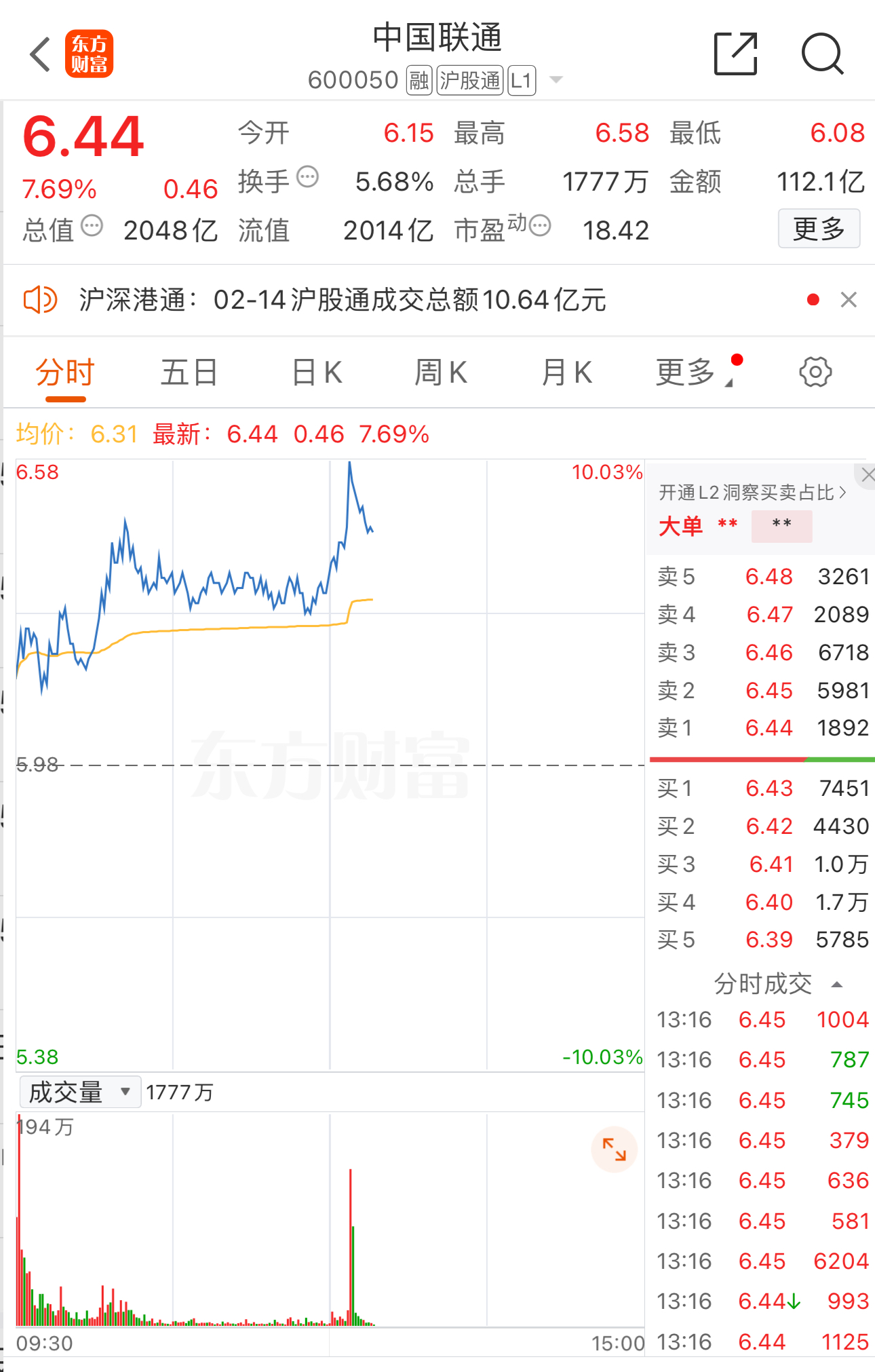 2月17日,中国联通午后一度触及涨停,股价创近6年新高。截至13时16分,该股涨7.69%,成交额超110亿元。