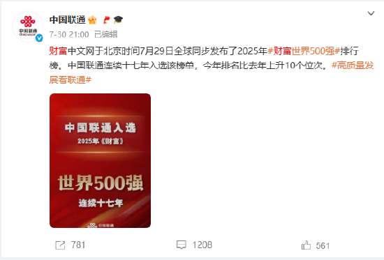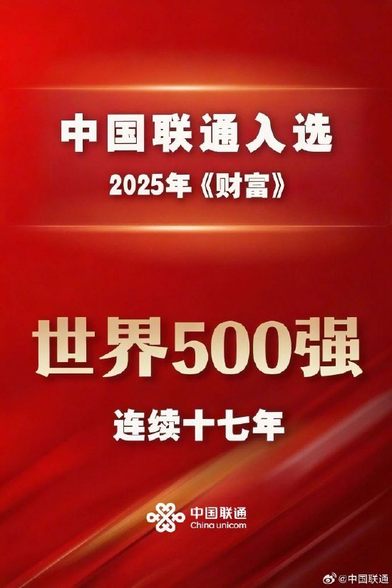 财富中文网于北京时间7月29日全球同步发布了2025年财富世界500强排行榜。中国联通连续十七年入选该榜单,今年排名比去年上升10个位次。