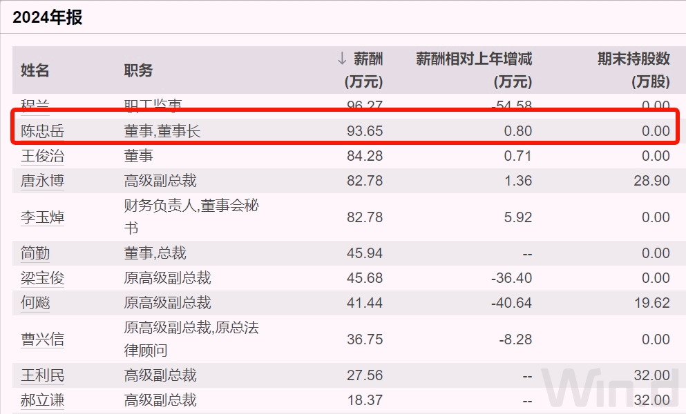 陈忠岳虽然担任集团一把手,但薪酬从股份公司领取。根据中国联通披露的财报显示,2024年他的税前薪酬约为94万元,在高层中位列第二。由于加入联通集团较晚,因此不像部分高管那样持有股份。