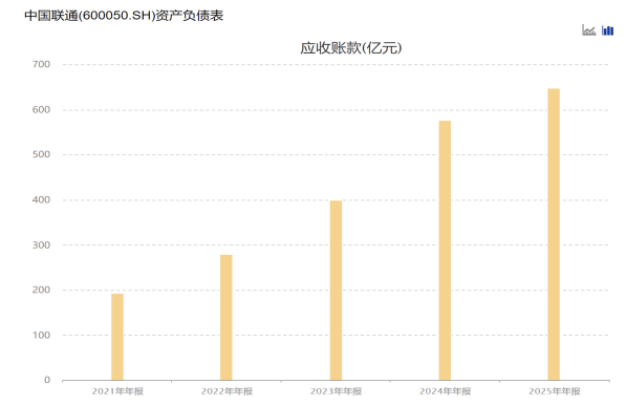 值得注意的是,近年来,中国联通的应收账款呈增长态势。2024年,受算网数智项目实施周期长、验收流程复杂等因素影响,公司应收账款同比增长超四成,达576.02亿元。到了2025年年底,公司应收账款进一步增至647.57亿元,同比增长12.42%,其增速高于营收增速。