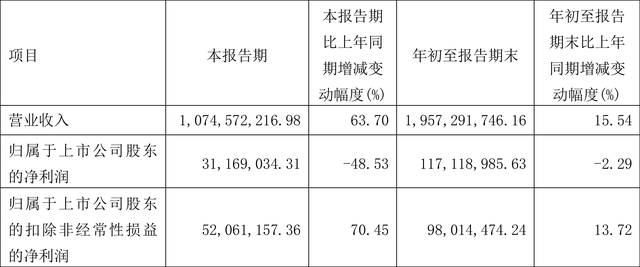 根据三季报,公司第三季度实现营业总收入10.75亿元,同比增长63.70%,环比增长116.28%;归母净利润3116.9万元,同比下降48.53%,环比下降65.94%;扣非净利润5206.12万元,同比增长70.45%,环比增长12.23%。