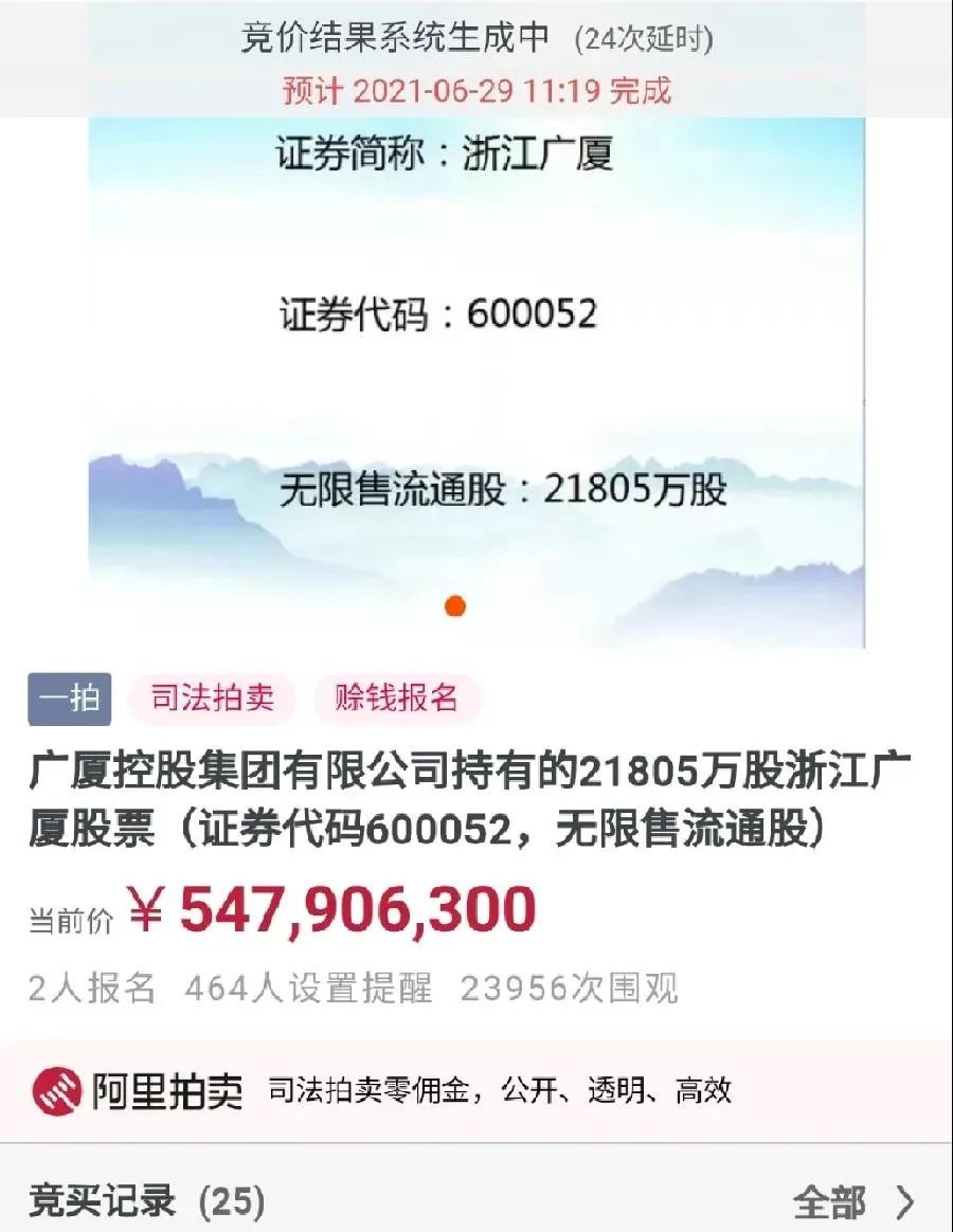 6月29日,被摆上阿里拍卖货架的浙江广厦2.18亿股正式开拍,该拍卖虽然仅有2人报名参拍,但竞价过程十分激烈。