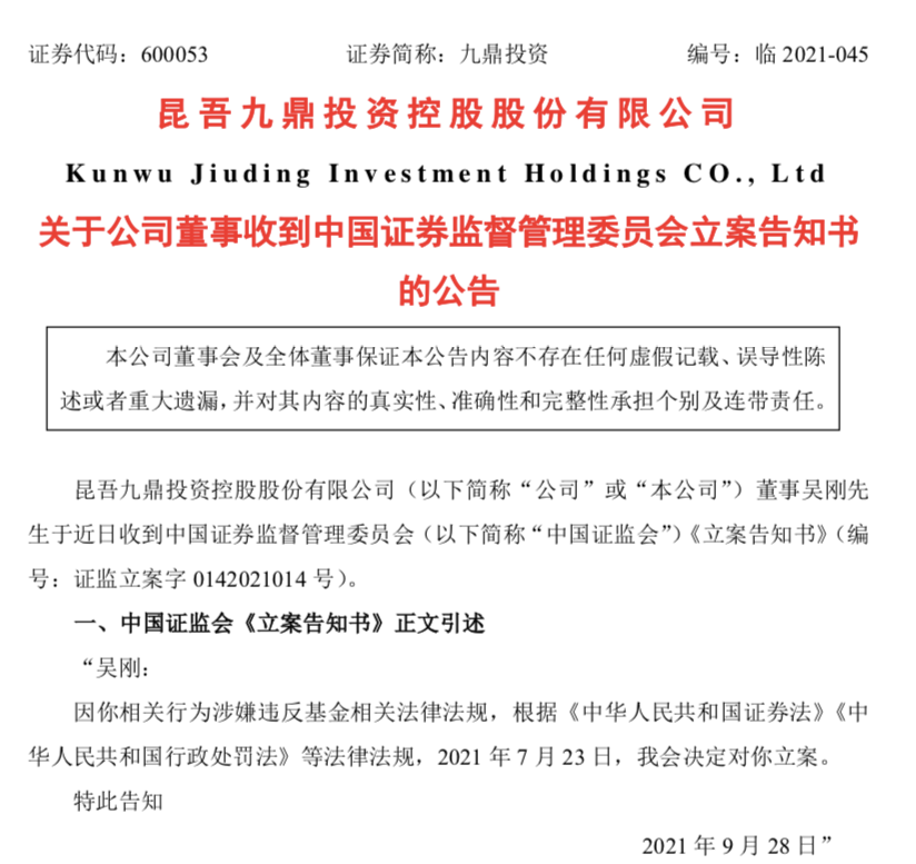 9月30日,九鼎投资(600053)发布公告,公司董事吴刚(九洲证券的第一大股东九鼎集团的董事长),收到中国证券监督管理委员会(以下简称“中国证监会”)《立案告知书》。同时,九鼎投资公布了《关于公司间接控股股东及相关责任人收到全国中小企业股份转让系统纪律处分决定书的公告》。公告显示,九鼎集团被给予公开谴责的纪律处分,同时也给予吴刚公开谴责的纪律处分,两者均记入证券期货市场。