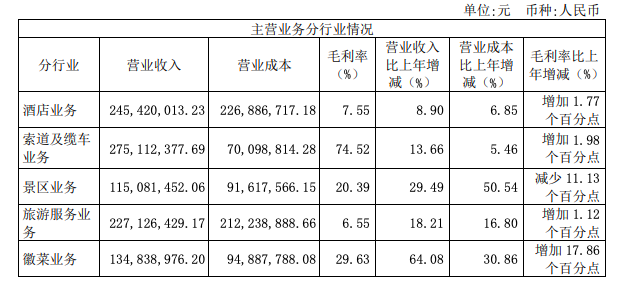 具体到业务表现来看,2021年,黄山旅游的索道及缆车以2.75亿元的营收、稳坐公司业务营收贡献排名的头把交椅。疫情前的营收贡献“王者”酒店业务,在2021年只能以2.45亿元的营收位居第二。酒店业务营收减少的背后,与徽菜业务从原酒店业务中剥离有一定关系。