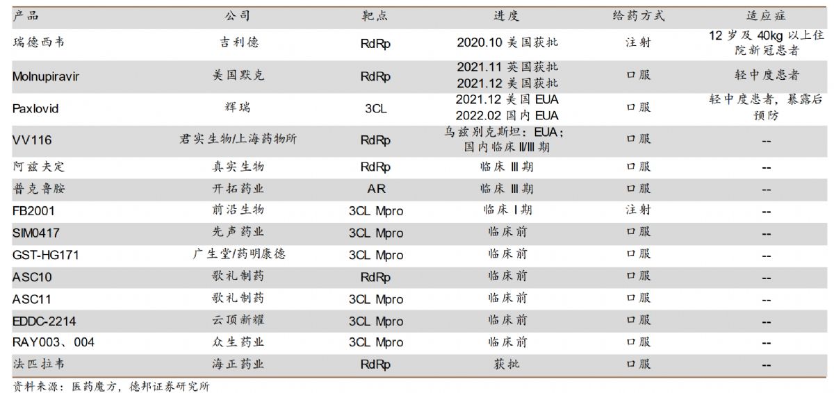 在抗病毒药物方面,中国也有多款候选药物进入临床前研究及临床试验,其中,君实生物的VV116已经在乌斯别克斯坦获批紧急使用,即将进入国际多中心的三期临床试验;另外前沿生物(FB2001,注射剂)进入一期临床试验;歌礼制药的ASC11计划2022年下半年在中美申报IND。需要注意的是,国内药企自研或引入的新冠口服特效药,都是全球权益。