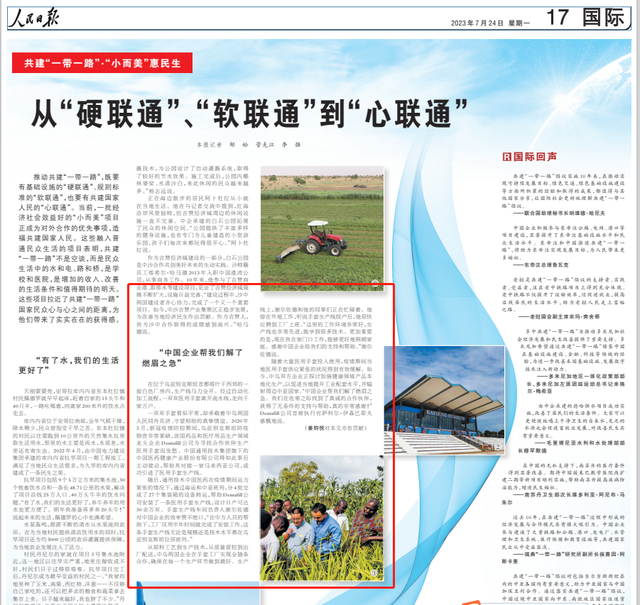 7月24日,人民日报以《从“硬联通”、“软联通”到“心联通”》为题报道中国企业在对外合作中积极实施了一批经济社会效益好的“小而美”项目,推动共建“一带一路”进一步走深走实。其中,“中国企业帮我们解了燃眉之急”讲述了通用技术中国医药助力乌兹别克斯坦建设医用手套工厂的项目,生动而详实地记录了公司海外员工与当地人民疫情期间同舟共济、守望相助的真挚情谊。
