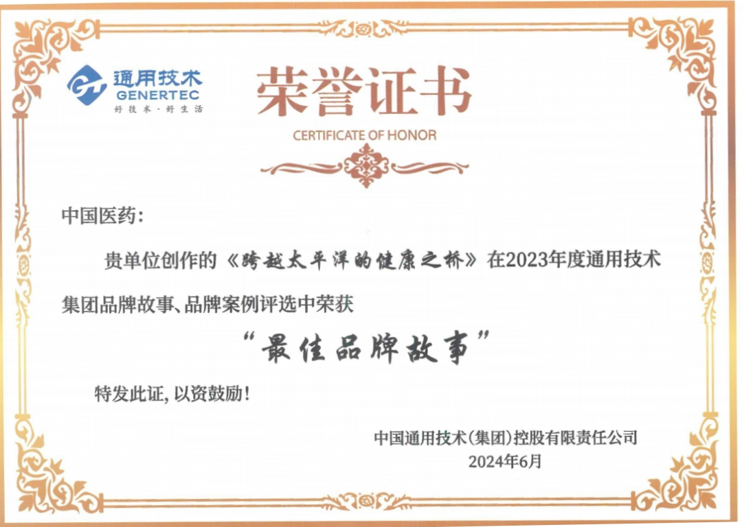 7月8日上午,通用技术集团召开2024年通用技术品牌建设表彰发布会。集团各单位报送的36个品牌案例和48个品牌故事经过层层选拔,最终经集团品牌管理委员会评审出最佳品牌故事和最佳品牌案例两类奖项。其中通用技术中国医药国际传播作品《跨越太平洋的健康之桥》荣获最佳品牌故事荣誉。公司董事长、党委书记杨光代表公司上台领奖。