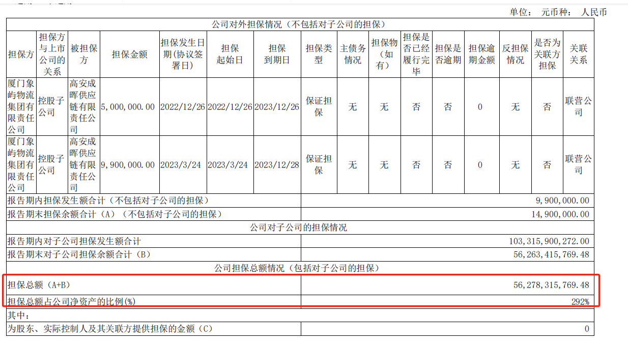 在高额的借款下,公司的EBITDA利息保障倍数出现大幅下滑,由去年同期的4.58倍下降至2.59倍,下降幅度达到43.45%。更令人担忧的是,厦门象屿还存在高额担保的情况,2023年上半年公司担保总额度达到562.78亿元,占公司净资产比重的292%。