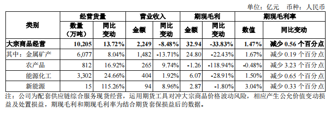 分类来看,金属矿产类的大宗商品营业收入达到1482亿,营业收占比最高,其期现毛利同比下降22.43%;而营业排名第二的农产品期现毛利率下降幅度最大,同比下降118.94%;能源化工,期现毛利为6.07亿,同比下降28.91%。