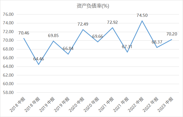 除了毛利率下滑外,厦门象屿近年来的资产负债率呈现处于高位运行。2018-2023年,厦门象屿的资产负债率常年在70%上下。一般来说,资产负债率超过70%,就意味着企业债务负担较重,可能存在着财务风险。这是因为一个高的资产负债率意味着企业已经用大量的借款进行了投资活动,而这些借款将来需要偿还。