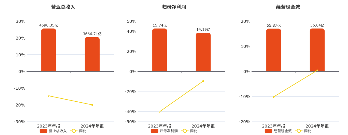 公司营业总收入为3666.71亿元,较去年同报告期营业总收入减少923.65亿元,同比较去年同期下降20.12%。归母净利润为14.19亿元,较去年同报告期归母净利润减少1.55亿元,同比较去年同期下降9.86%。经营活动现金净流入为56.04亿元,较去年同报告期经营活动现金净流入增加1789.51万元,同比较去年同期上涨0.32%。