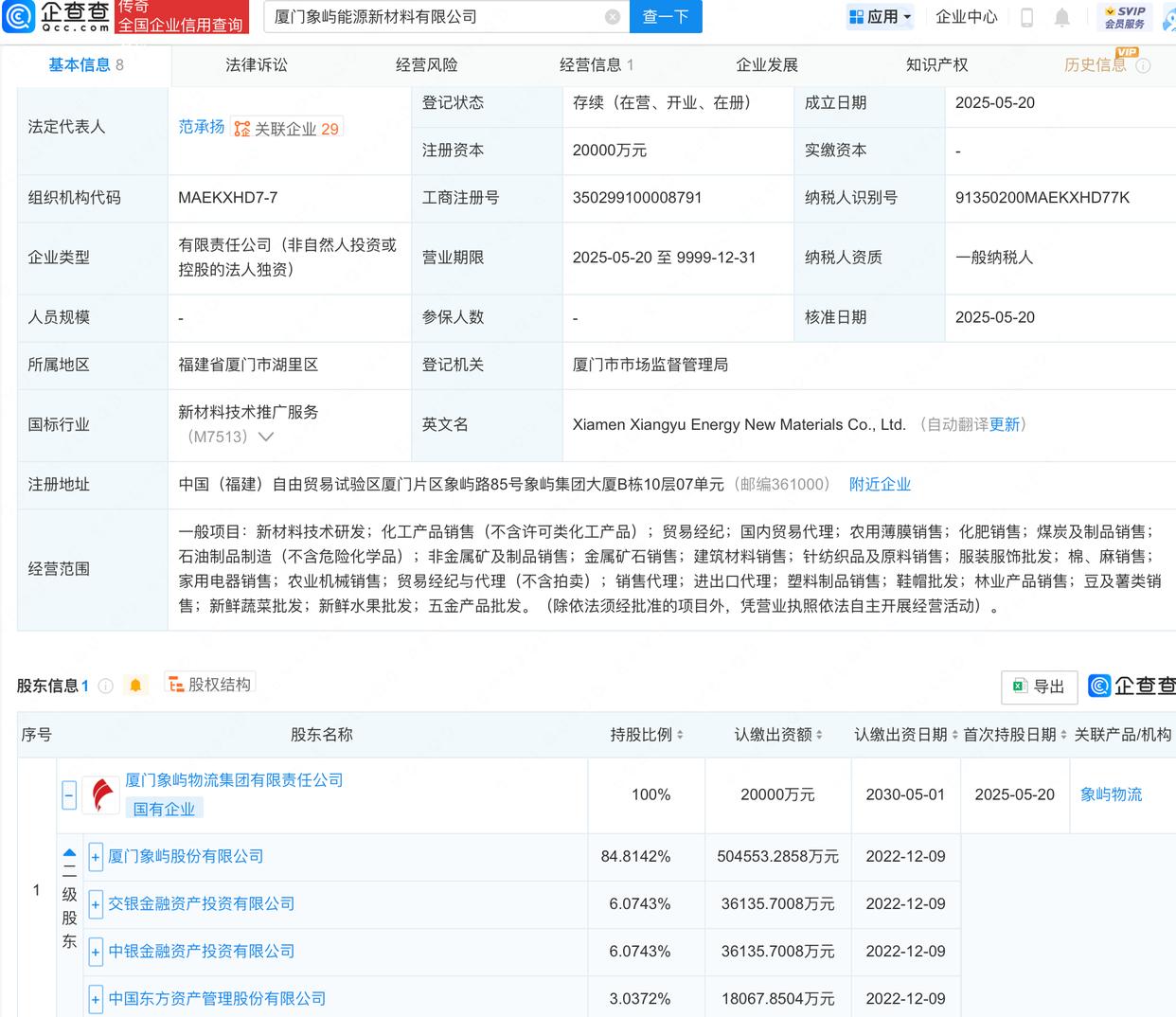 厦门象屿能源新材料有限公司成立,注册资本2亿元,经营范围包含:贸易经纪;国内贸易代理;农用薄膜销售;化肥销售;煤炭及制品销售等。股权穿透显示,该公司由厦门象屿(600057)旗下厦门象屿物流集团有限责任公司全资持股。
