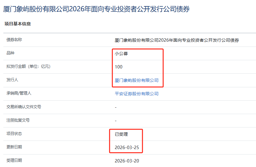 披露,厦门象屿股份有限公司2026年面向专业投资者公开发行公司债券项目状态更新为“已受理”。上述债券品种为小公募,拟发行金额为100亿元。