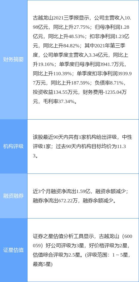 古越龙山公布2021年年度报告,2021年公司实现营业收入15.77亿元,同比增长21.19%;归属于上市公司股东的净利润2.00亿元,同比增长33.21%;拟向公司全体股东按每10股派发现金红利0.8元(含税)进行分配。