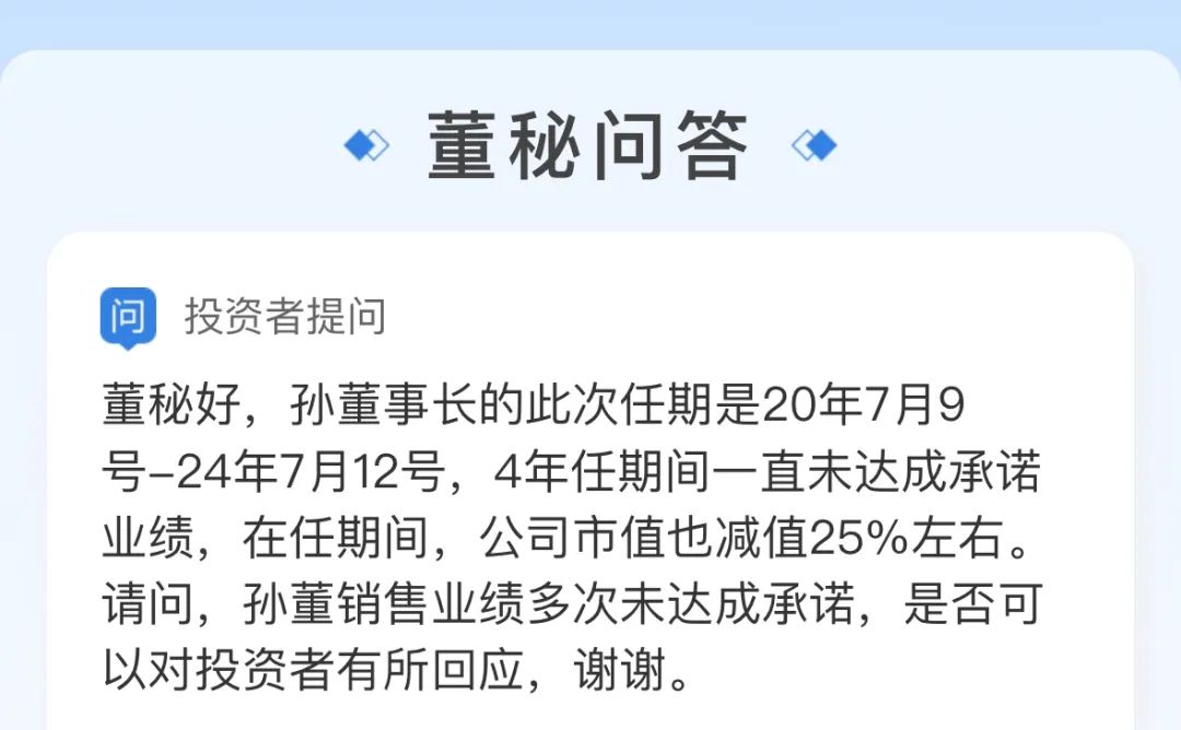 “孙爱保董事长此次任期是2020年7月9日—2024年7月12日,在任4年期间一直未达成承诺业绩,是否可以对投资者有所回应”,面对公司连续的业绩失约,有股民6月份在投资者平台上向董秘表达了不满。