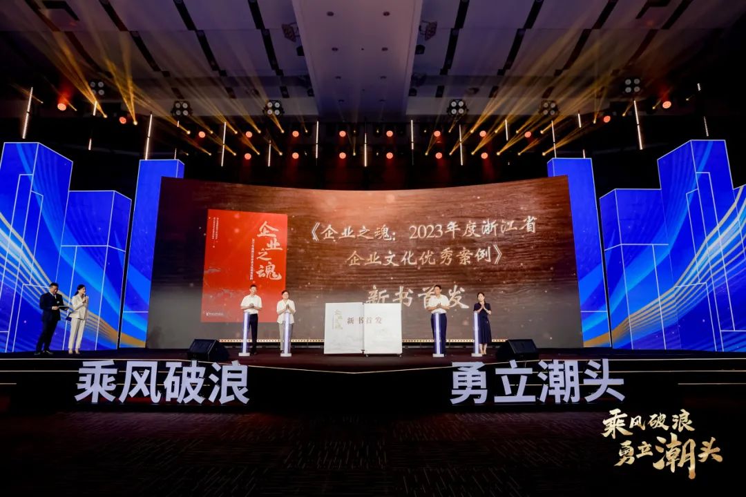 活动现场,对入选《企业之魂:2023年度浙江省企业文化优秀案例》的50家企业颁发了奖杯和证书。黄酒集团党委副书记、监事会主席杨文龙(右五)上台领奖。
