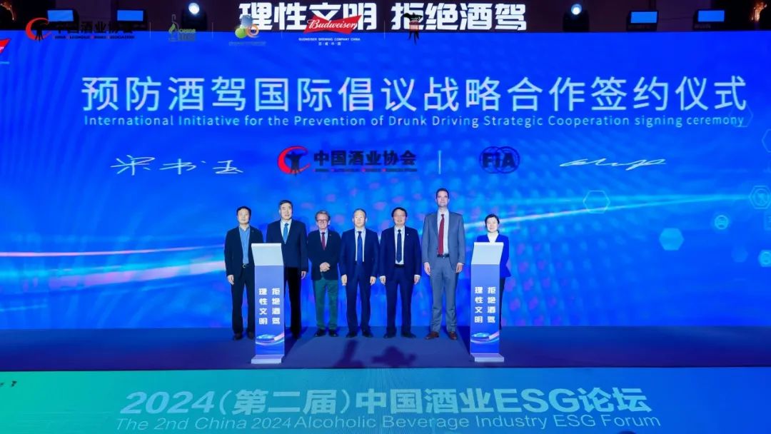 在中国酒业协会和国际汽联亚太区共同发起的“全球联合预防酒驾倡议书”签约仪式上,宋书玉理事长与国际汽联亚太区主席格雷格·克拉夫特上台签约,浙江古越龙山绍兴酒股份有限公司党委书记、董事长孙爱保与百威亚太首席执行官兼联席主席杨克,贵州茅台酒厂(集团)有限责任公司总经理王莉,宜宾五粮液集团(股份)公司党委书记、董事长曾从钦,青岛啤酒集团公司党委书记、董事长黄克兴一起,上台见证签约。