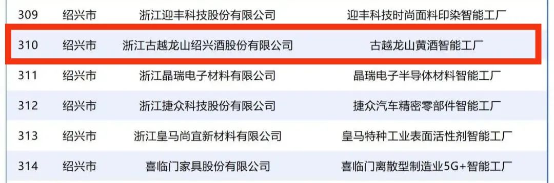 5月22日,2025年浙江省先进级智能工厂(第一批)名单公布,古越龙山黄酒智能工厂凭借其卓越的智能制造实力和数字化水平,成为黄酒行业唯一上榜的智能工厂!此次入选标志着古越龙山在智能制造领域的领先地位再获权威认证,为传统黄酒产业数智化转型树立新标杆。