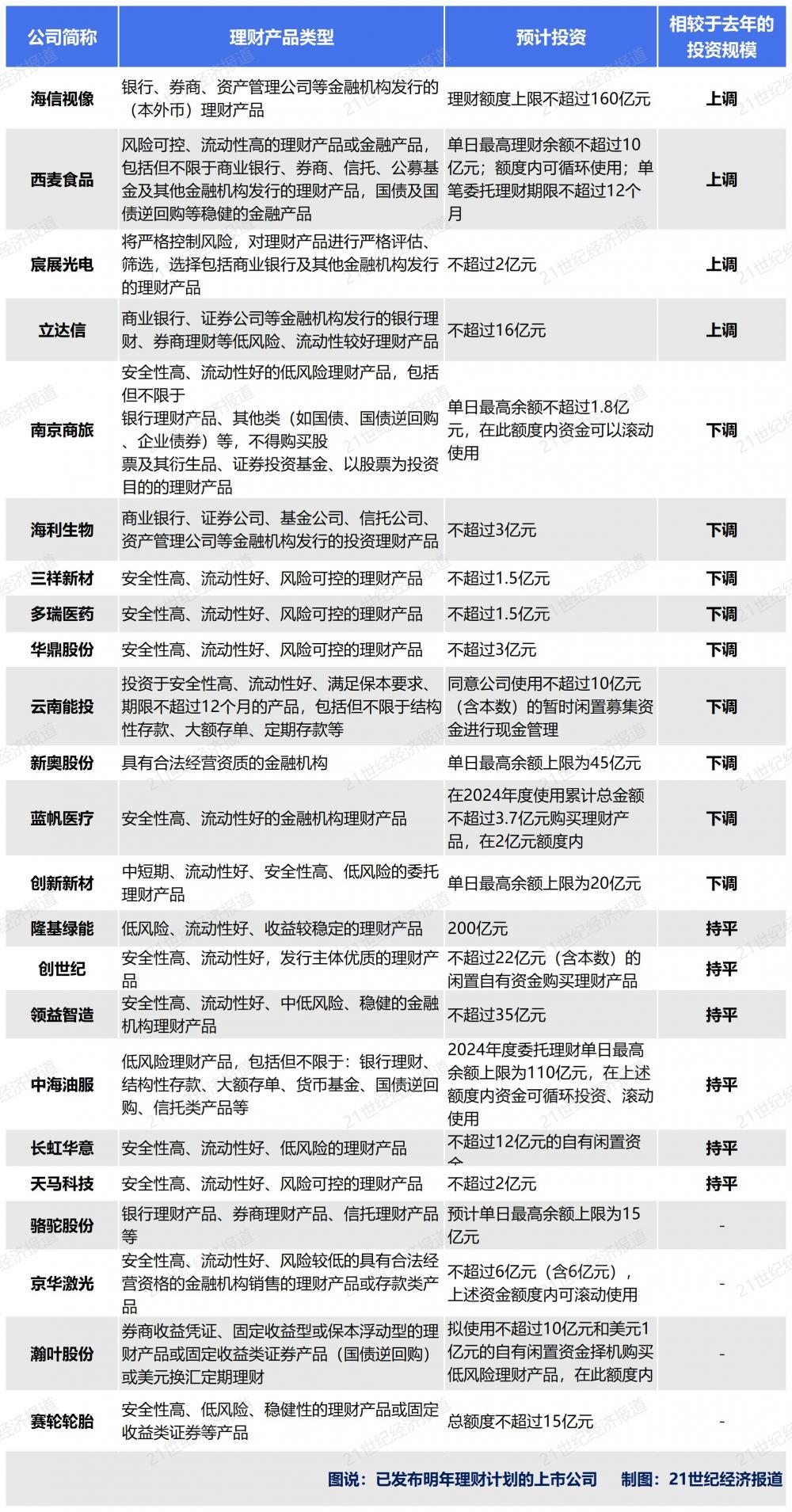 与此同时,中海油服(601808.SH)、创世纪(300083.SZ)、领益智造(002600.SZ)、长虹华意(000404.SZ)、隆基绿能(601012.SH)等多家上市公司计划使用闲置资金购买理财产品的规模与去年同期持平。
