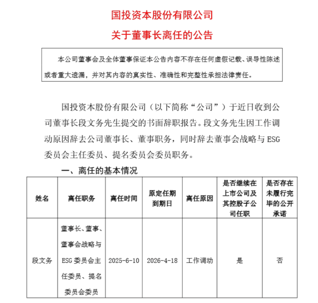 近日,A股上市公司国投资本发布公告,宣布其董事长段文务因工作调整已于6月10日正式离任。这一人事变动标志着段文务在国投资本的董事长任期画上句号,同时也开启了他在中国五矿集团的新篇章。