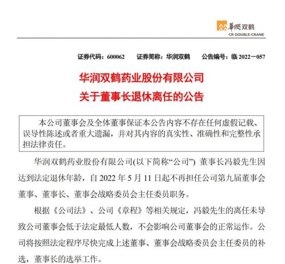 5月12日,华润双鹤发布公告称,董事长冯毅因达到法定退休年龄,自2022年5月11日起不再担任第九届董事会董事、董事长、董事会战略委员会主任委员职务。