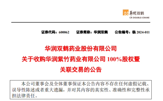 近日,华润双鹤发布公告,公司董事会审核同意公司以3,115,453,100.00元收购华润紫竹药业有限公司100%股权。