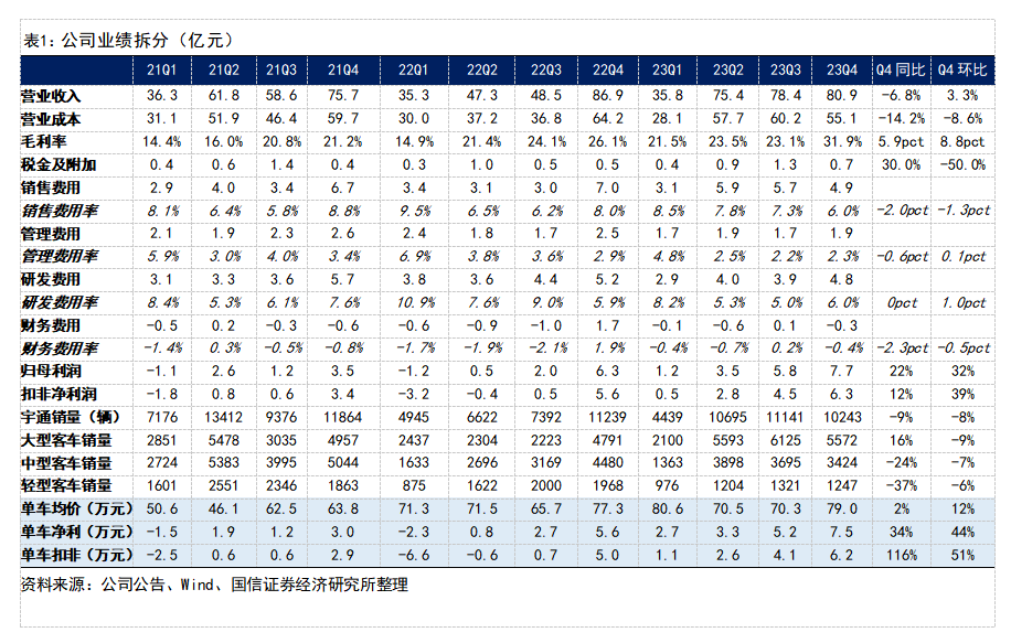 销量端来看,2023年宇通实现客车销量36518辆,同比增长20.9%,其中出口10165辆,同比+78.9%,国内销量26353辆,同比+7.5%。单季度看,23Q4收入80.9亿元,同比-6.8%,环比+3.3%;实现归母净利润7.7亿元,同比+22%,环比+32%;2023年海外均价102.4万元,同比+4%,主要系高端化、定制化产品占比提升;国内均价52.0万元,同比-8.6%,主要系结构性变化(23年新能源公交占比下滑)。