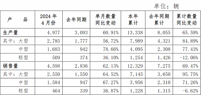 宇通客车5月6日公告,前4月销量1.23万辆,同比上涨69.47%。