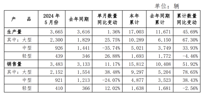 宇通客车6月5日公告,5月销量3483辆,同比增长11.17%;本年累计销量1.58万辆,同比增长51.92%。