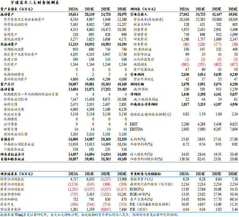 由于公司客车出口销量超预期兑现,出口单车盈利更高,我们维持公司2024~2026年营业收入为347/414/499亿元,同比+28%/+19%/+20%,上调2024~2025年归母净利润为33.1/41.1亿元(原为29.7/39.8亿元),维持2026年归母净利润49.6亿元,同比+82%/+24%/+21%,对应EPS为1.5/1.9/2.2元,对应PE为17/14/11倍,维持“买入”评级。