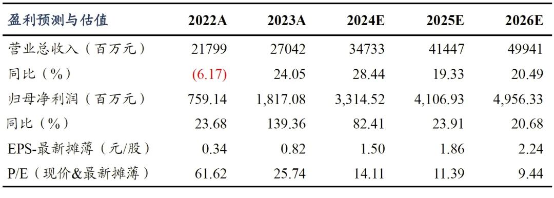 我们维持公司2024~2026年营业收入为347/414/499亿元,同比+28%/+19%/+20%,维持2024~2026年归母净利润为33.1/41.1/49.6亿元,同比+82%/+24%/+21%,对应EPS为1.5/1.9/2.2元,对应PE为14/11/9倍,维持“买入”评级。