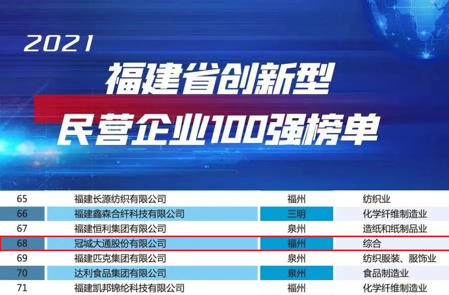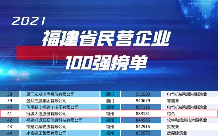 根据榜单,2021福建民营企业100强规模总量不断壮大,还呈现出头部企业优势明显、质量效益总体平稳、区域分布差异明显、社会贡献更加彰显、产业结构持续优化等特点,彰显民营经济是福建发展的特色所在、活力所在、优势所在。冠城大通能够再获殊荣,充分体现了社会及行业对公司综合实力的认可。近年来,冠城大通贯彻新发展理念,融入新发展格局,坚守主业、坚持实业,实现企业稳健发展,得到了地方政府及社会各界的广泛认可。未来,公司还将以此为契机,发挥福建百强企业的引领作用,在谱写新时代福建高质量发展新篇章中展现更大作为。