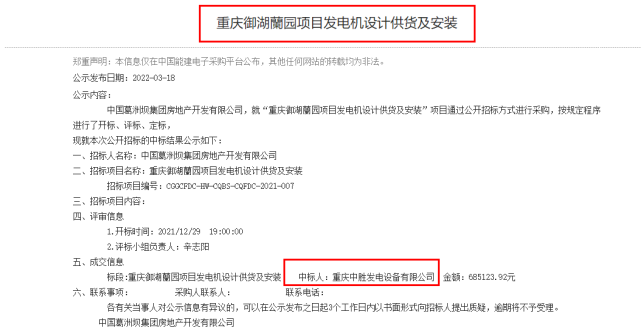 2022年3月18日中国葛洲坝集团股份有限公司就“重庆御蘭园发电机设计供货及安装”项目进行公开招标方式进行采购,重庆中胜发电设备有限公司成功中标。